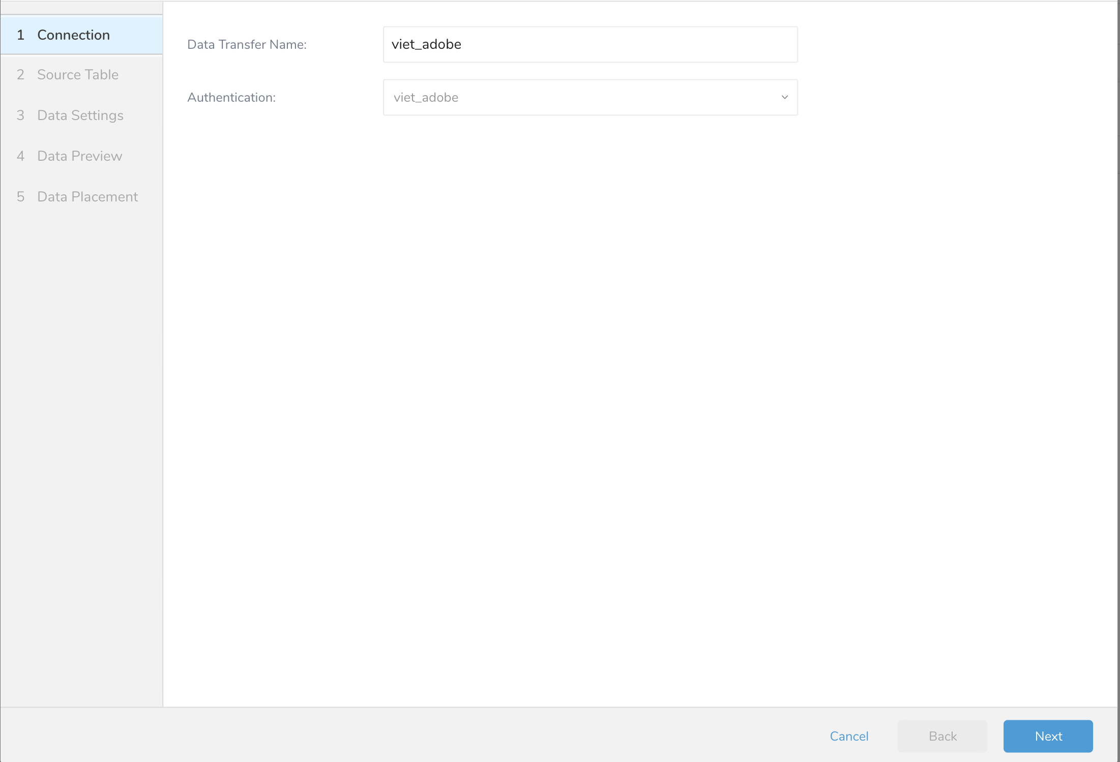 Now that you have created the connection to your remote Adobe Analytics' SFTP instance, the next step is getting the data from your Adobe Analytics' SFTP server into Treasure Data. You can set up an ad hoc one time transfer or a recurring transfer at a regular interval. In this section, you specify source details as described in the following steps.