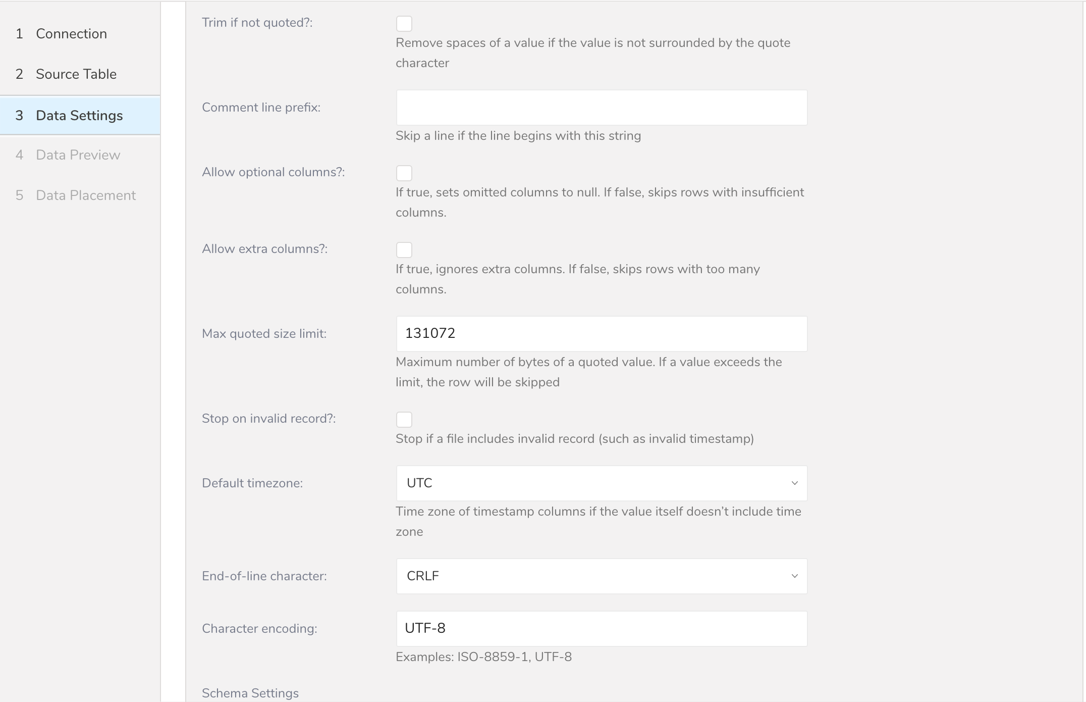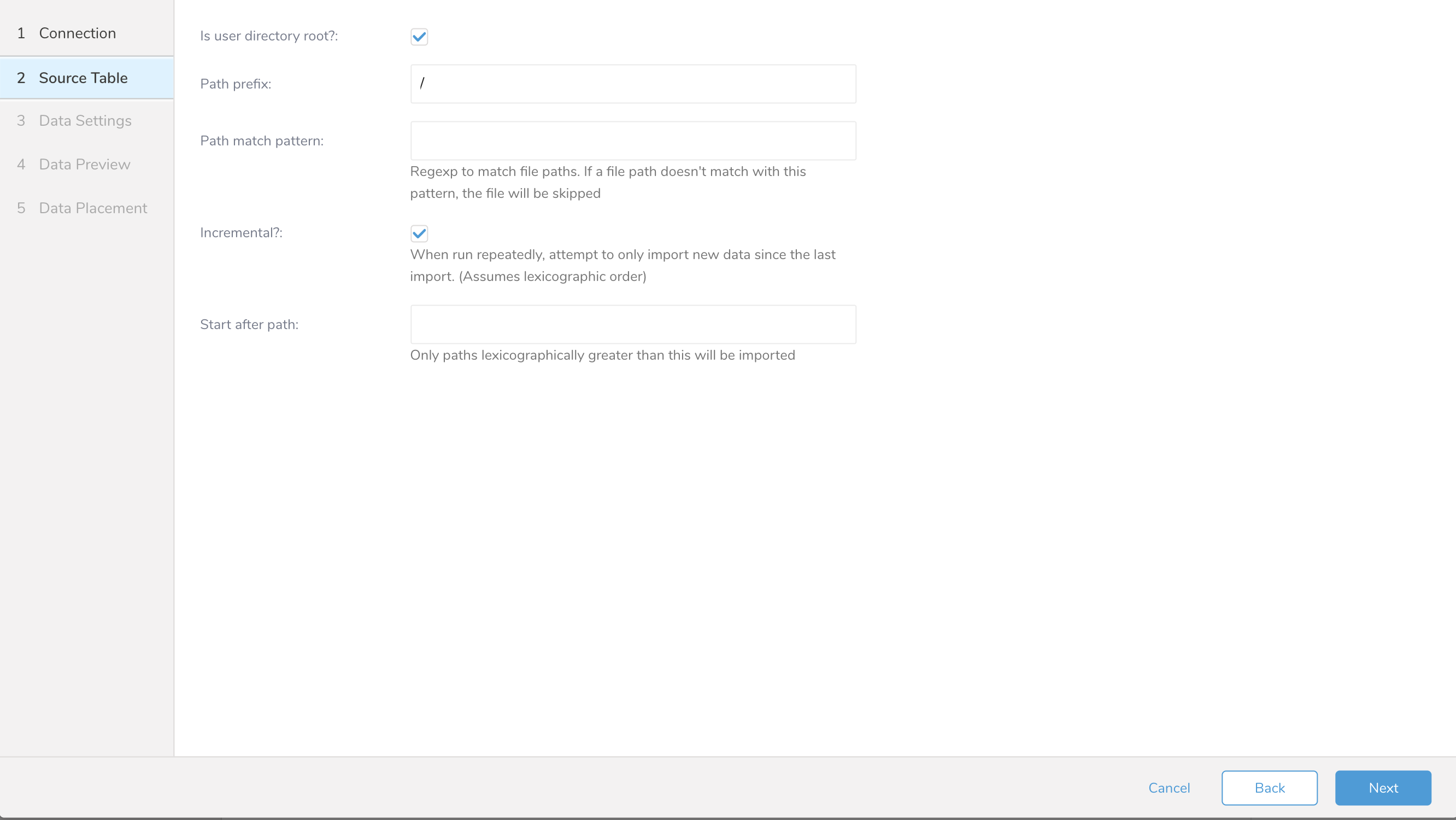 | Incremental | Enables incremental loading (boolean, optional. default: true. If incremental loading is enabled, the config diff for the next execution will include last_path parameter so that next execution skips files before the path. Otherwise, last_path is not included. |