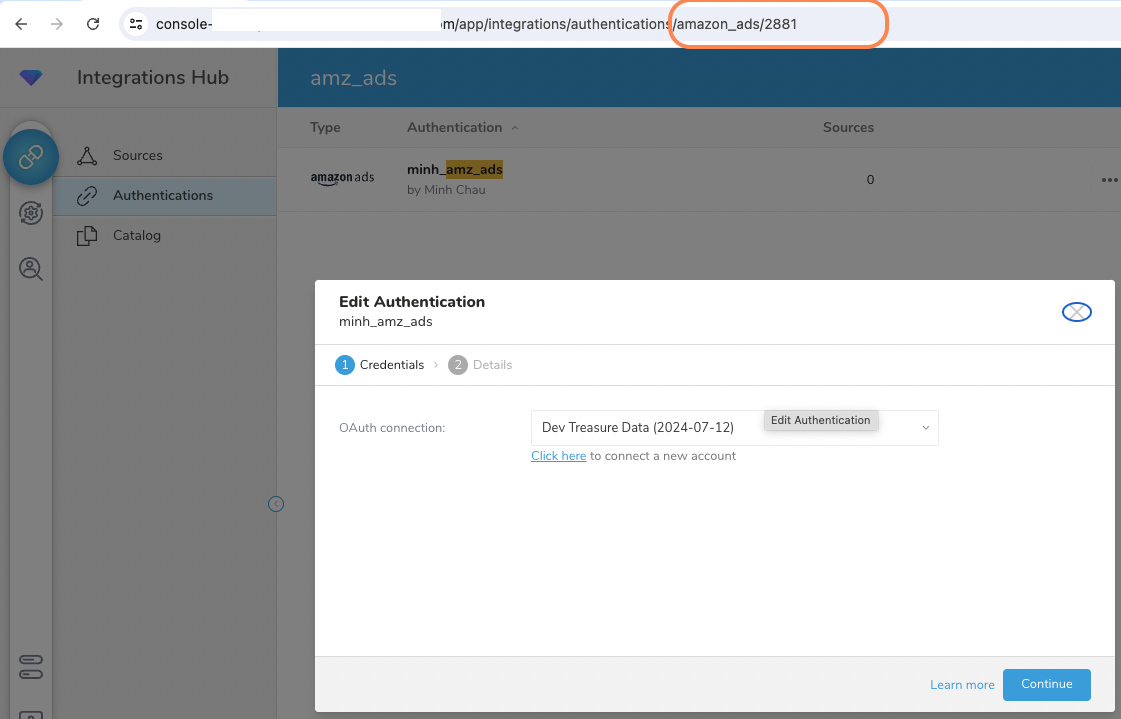 | td_authentication_id | The authentication ID for the Amazon Ads authentication in the TD. Console. See Getting the Authentication ID for information on how to determine the value for this ID. | Yes | ||
