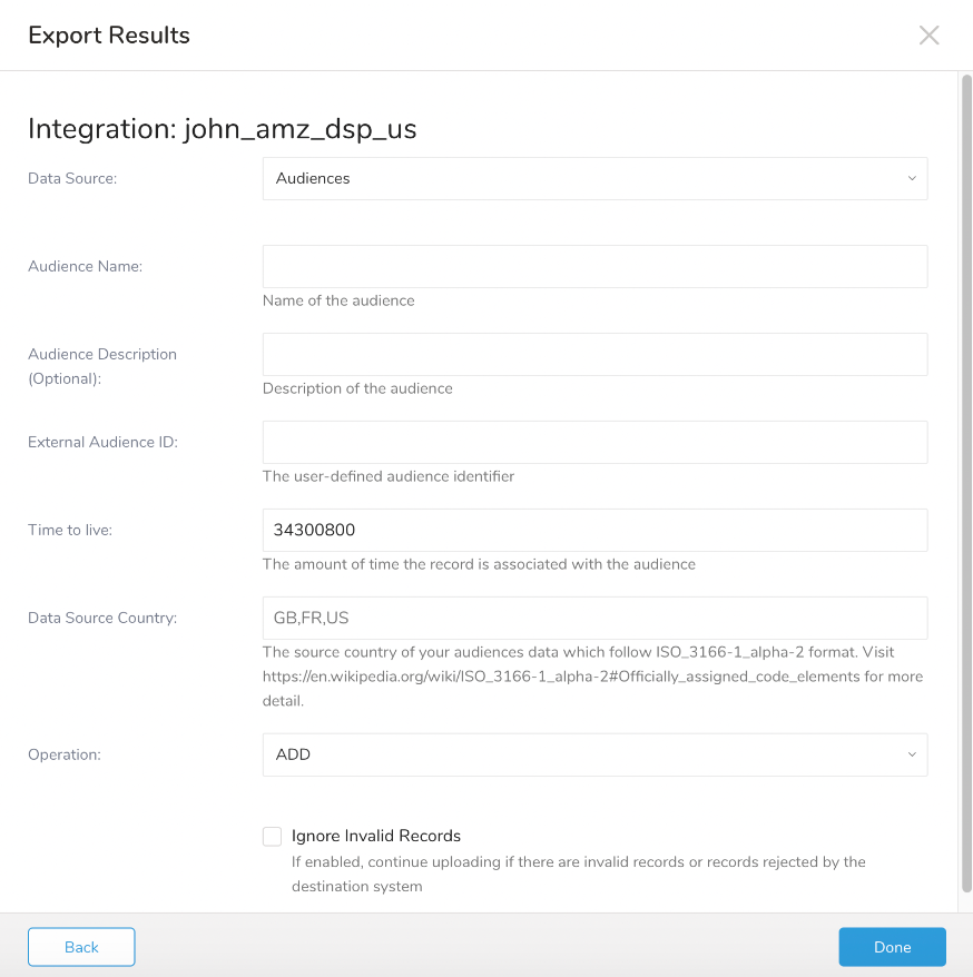- Enter values for the Audience Name, Audience Description, External Audience ID, Time to live, Data Source Country, Operation, and Ignore Invalid Records fields**.