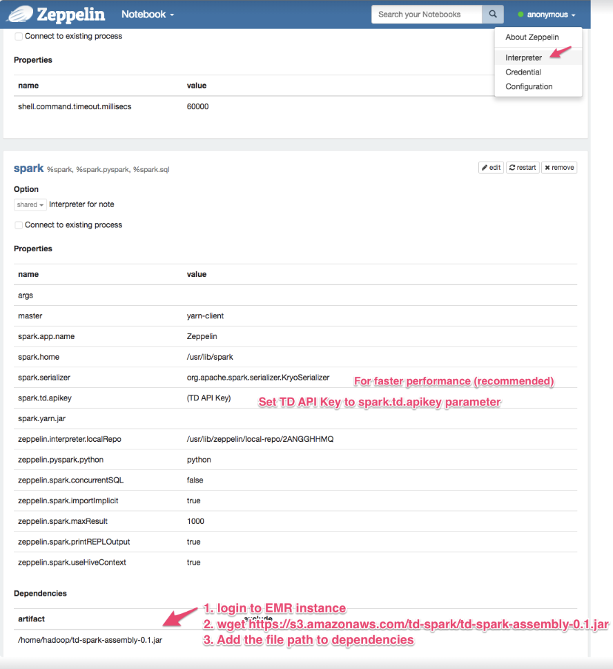 $ ssh -i (your AWS key pair file. .pem) -D8157 hadoop@ec2-xxx-xxx-xxx-xxx.compute-1.amazonaws.com(For Chrome users) Install Proxy Switchy Sharp Chrome ExtensionTurn on proxy-switch for EMR when accessing your EMR master 2. Open http://(your EMR master node public address):8890/ 3. Open the Interpreters page to configure td-spark.