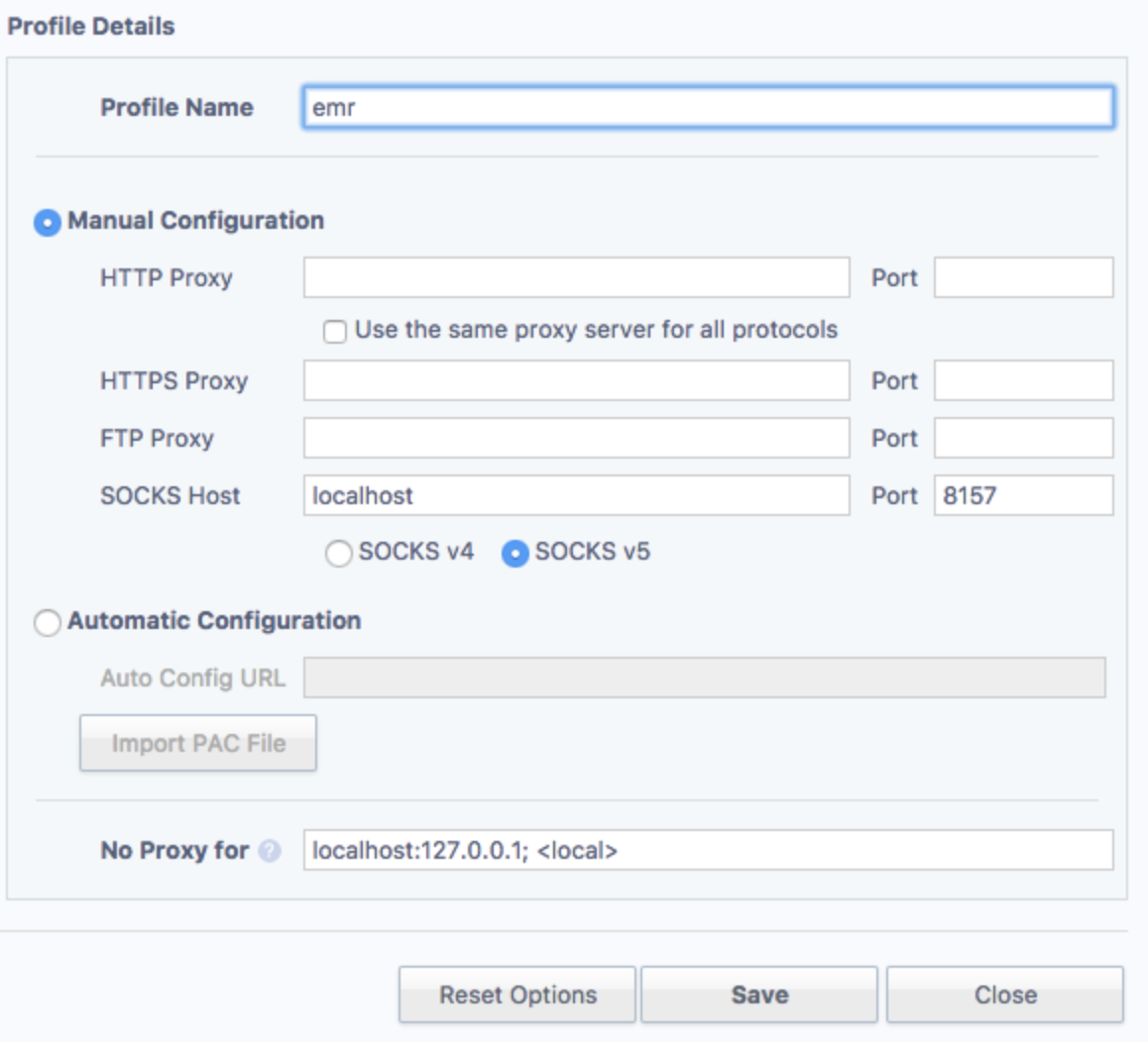 $ ssh -i (your AWS key pair file. .pem) -D8157 hadoop@ec2-xxx-xxx-xxx-xxx.compute-1.amazonaws.com