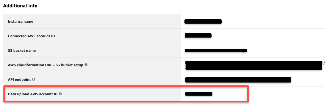 - You can get the Data upload AWS account ID from the Instance Info page.