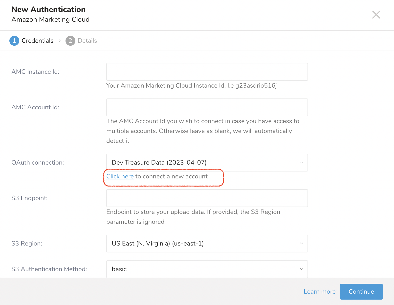 - Select the Click here link in New Authentication to connect to a new Amazon Account.