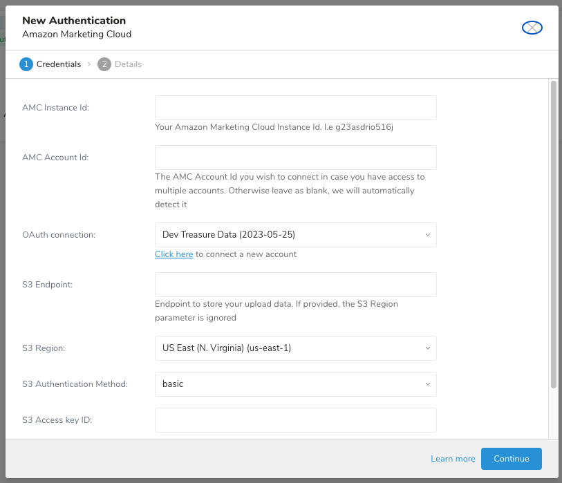 - (Optional) Create the dataset definition before using the Amazon Marketing Cloud Export Integration. Visit Treasure Boxes to see an example of dataset creation workflow. This integration supports creating a dataset the first time the activation runs.