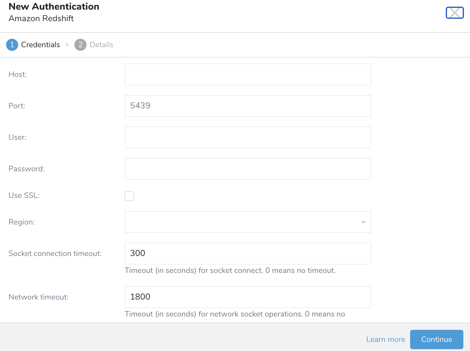 | Region | The AWS regions in which your Redshift instance is hosted. Specify the region where your Redshift instance is located. This option is required if your hostname does not contain the region name. redshift://user:password@host/database/table?region=us-east-1 |