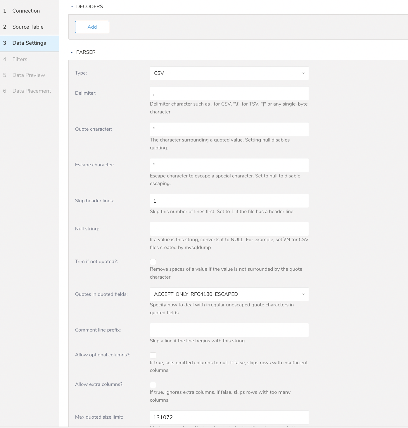 | Path Regex | Use regexp to match file paths. The file is skipped if a file path doesn't match the specified pattern. For example, if you select the pattern .csv$ #, a file is skipped if its path doesn't match the pattern. Read more about regular expressions. |