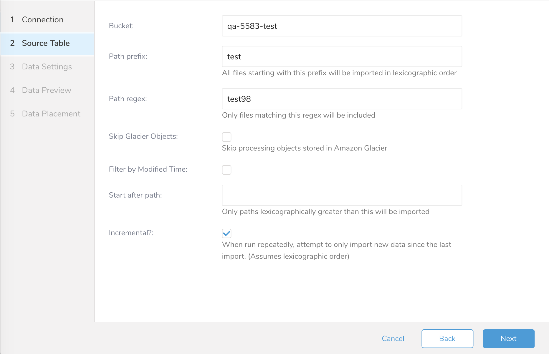 - If use_modified_time is disabled, the last path is saved for the next execution. On the second and subsequent runs, the connector only imports files that come after the last path in alphabetical order.