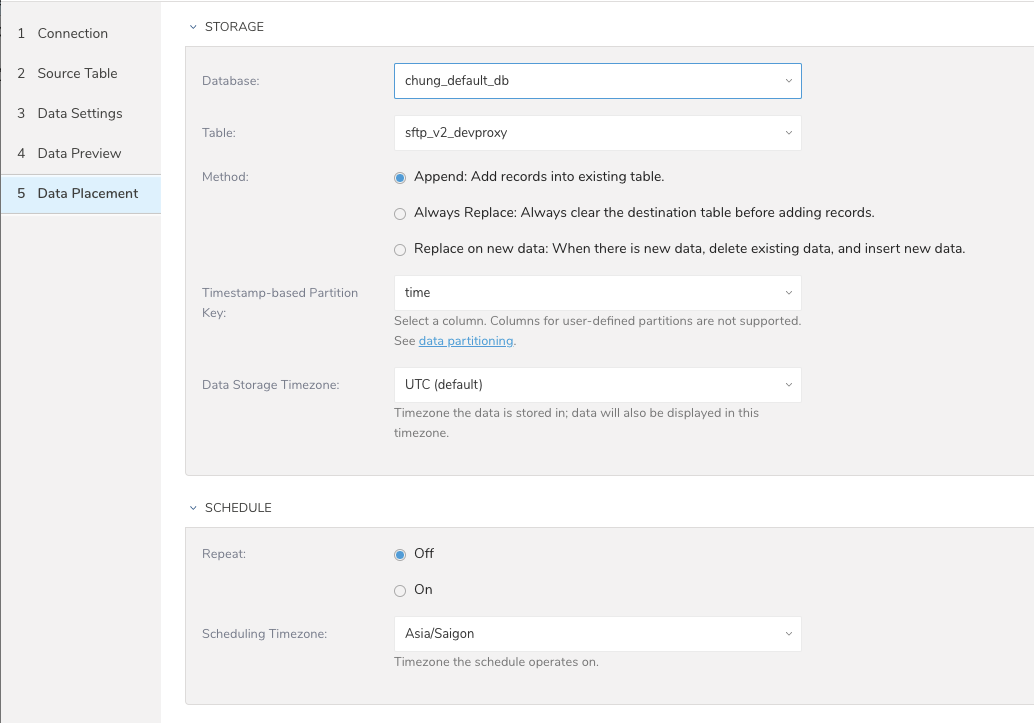 For data placement, select the target database and table where you want your data placed and indicate how often the import should run.