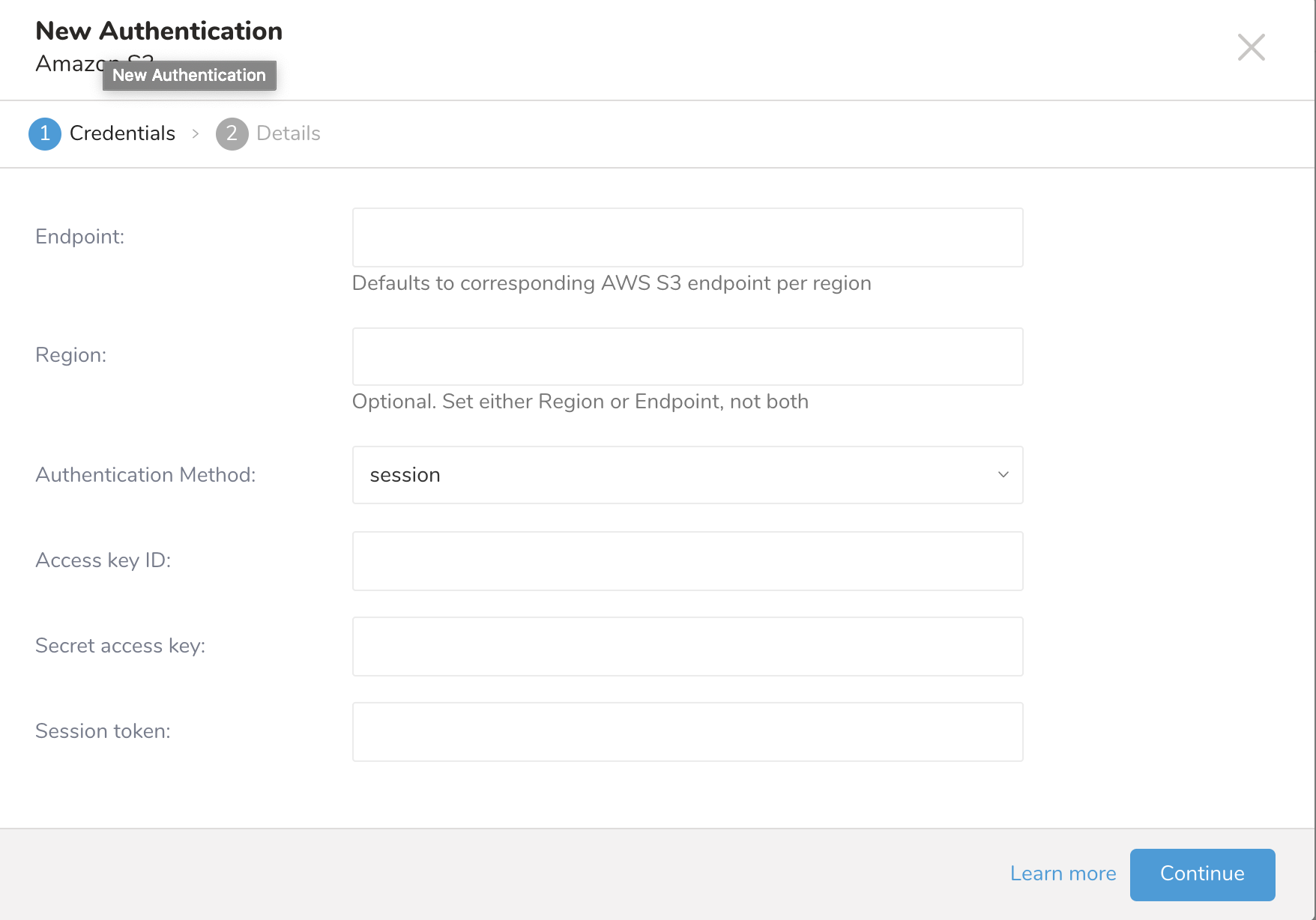 - The New Authentication dialog opens. You need a Access key ID and a Secret access key to authenticate using credentials.