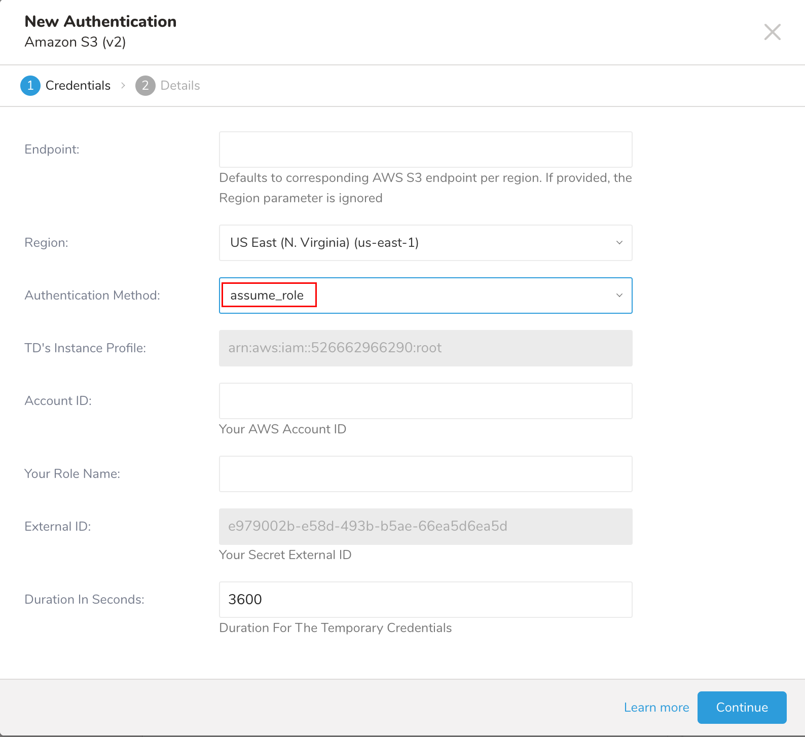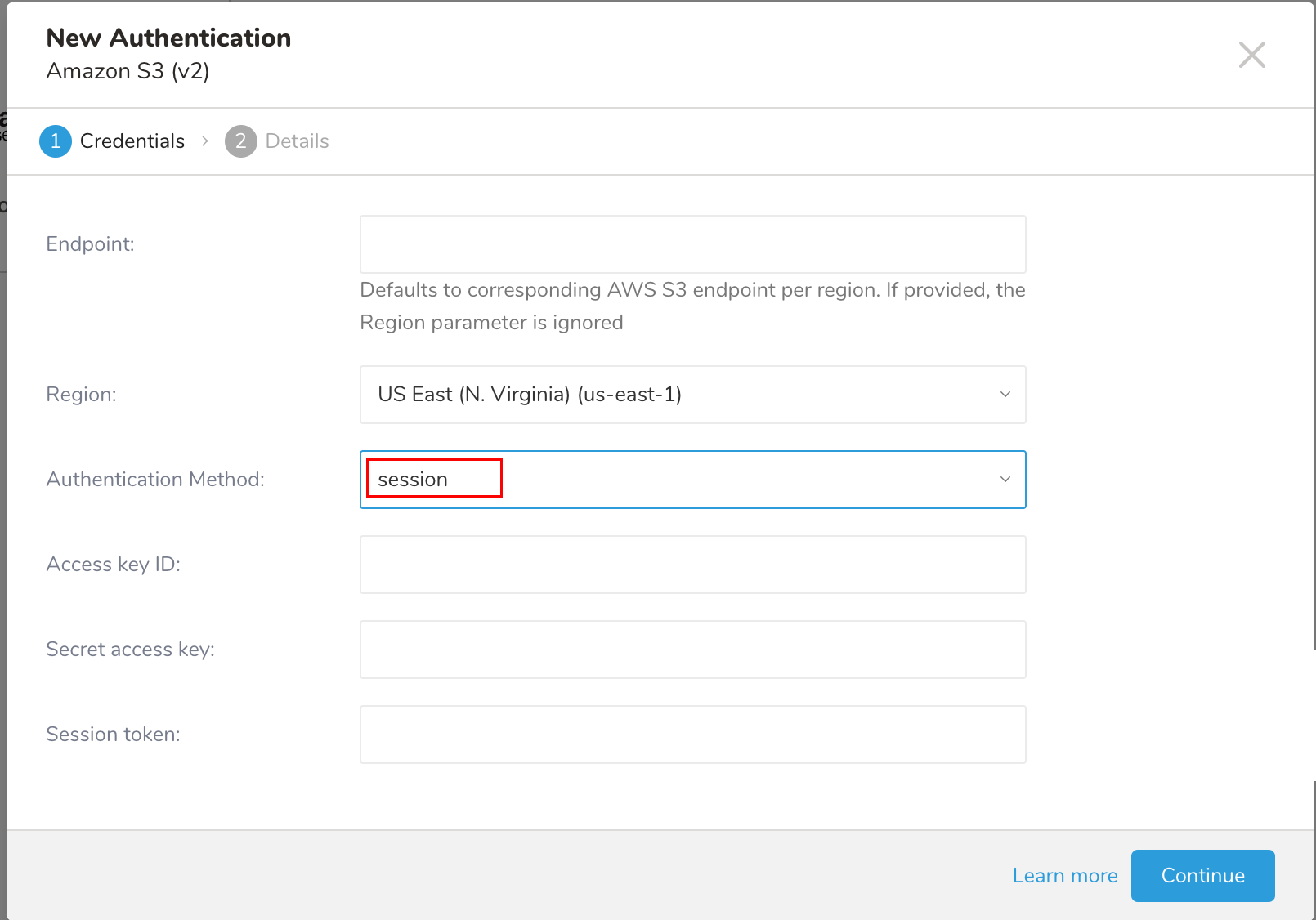Review the information in the following table to understand the authentication differences between v2 and v1. For v1 details, see Amazon S3 Import Integration v1.