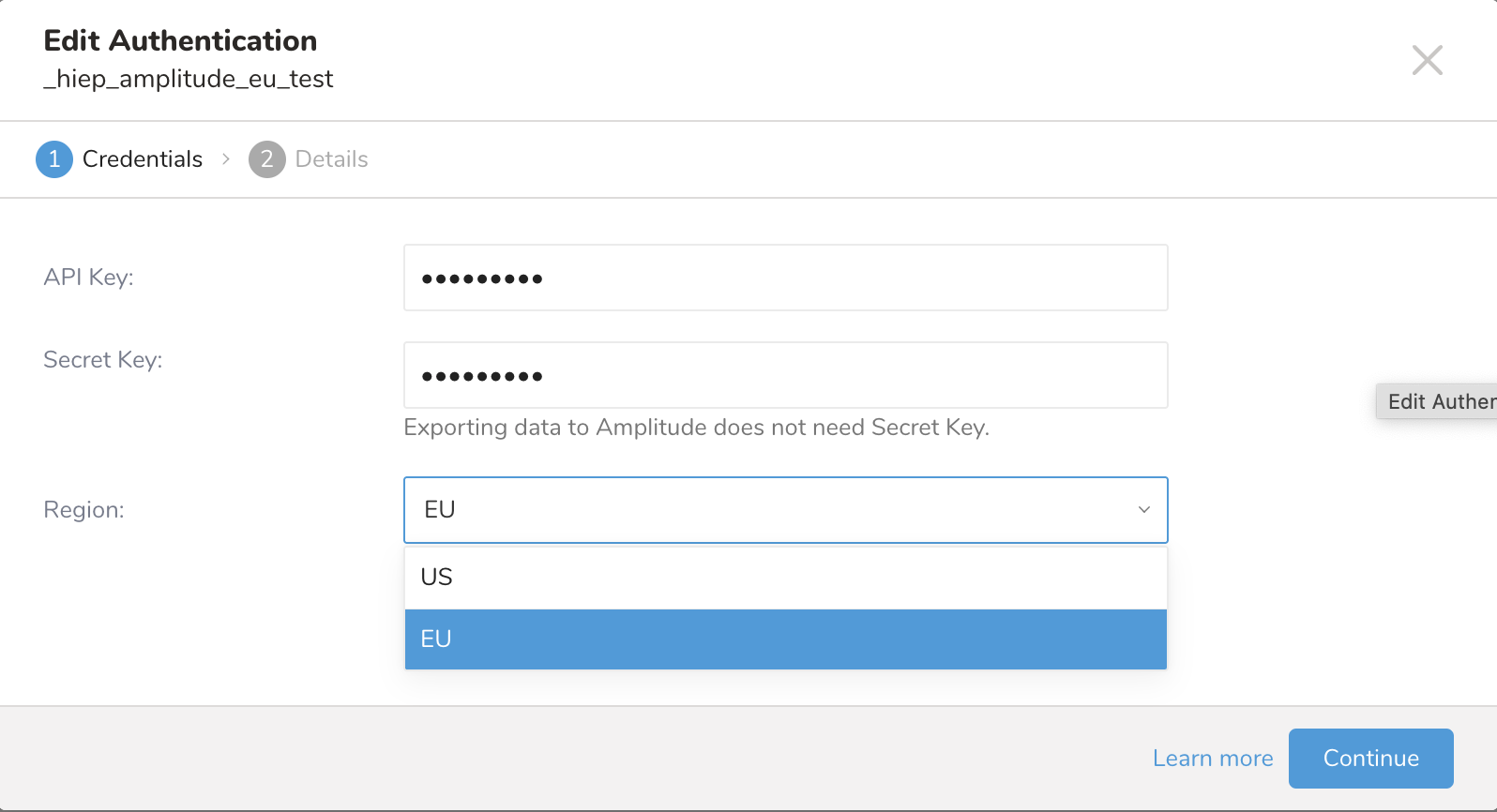 | region | The API region for Amplitude export data. | Supported values: - US - EU | US | Yes |