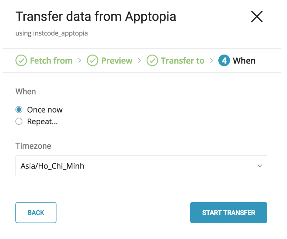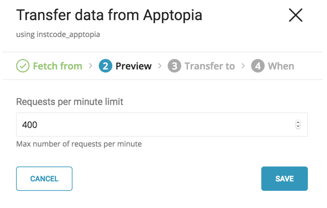 If you have multiple transfers under the same Apptopia account, you can control the rate limit usage of each transfer via requests_per_minute_limit in advanced settings as long as the total limit does not exceed your account limit. For example, assume that your account has quotas as 1000 calls/minute, if you create 2 transfers, e.g. app_performance & publisher_performance targets, you could use 600 rpm for app_performance transfer and the rest (400 rpm) for publisher_performance transfer.