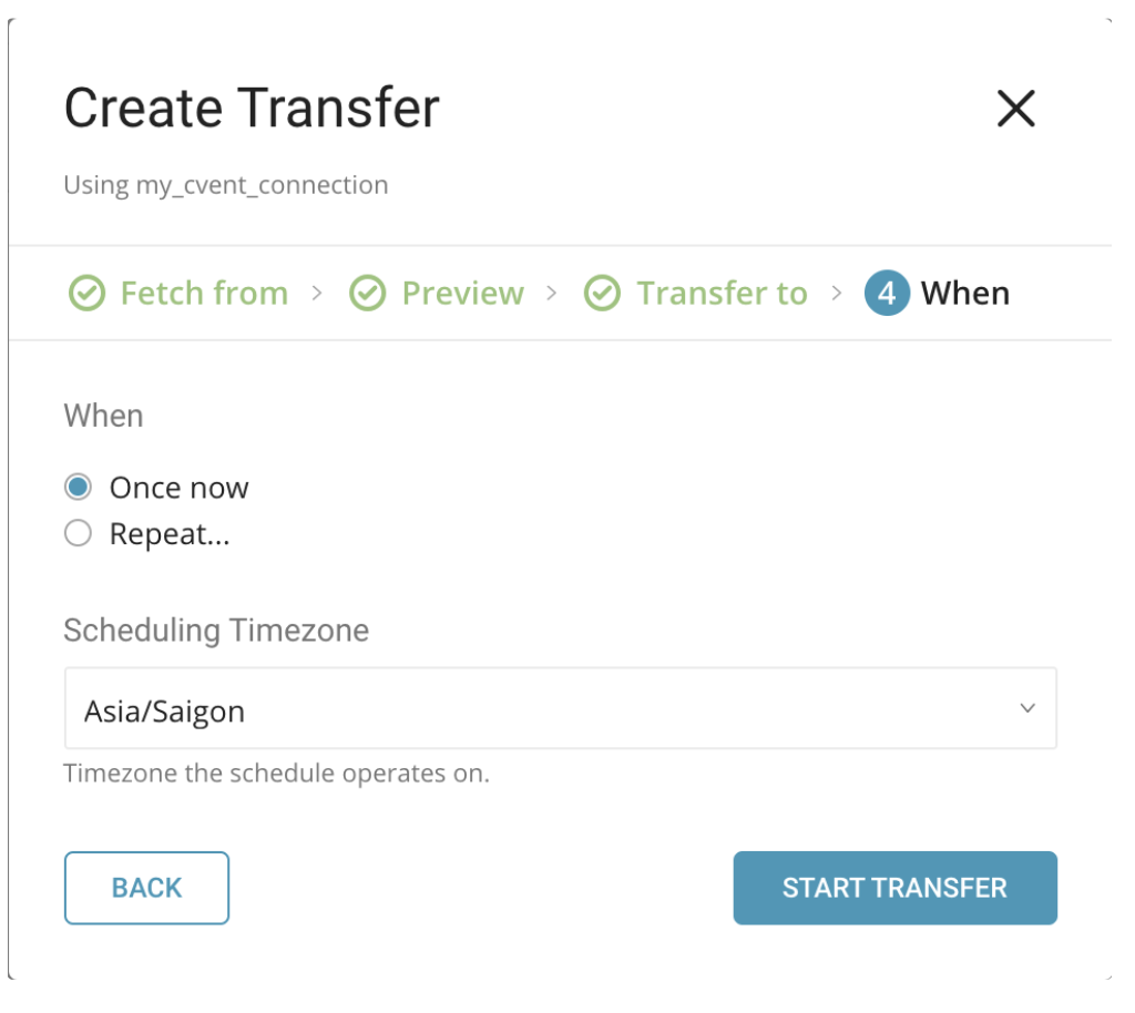 --auto-create-tableYou can schedule periodic data connector execution for periodic Cvent import. By using this feature, you no longer need a cron daemon on your local data center.