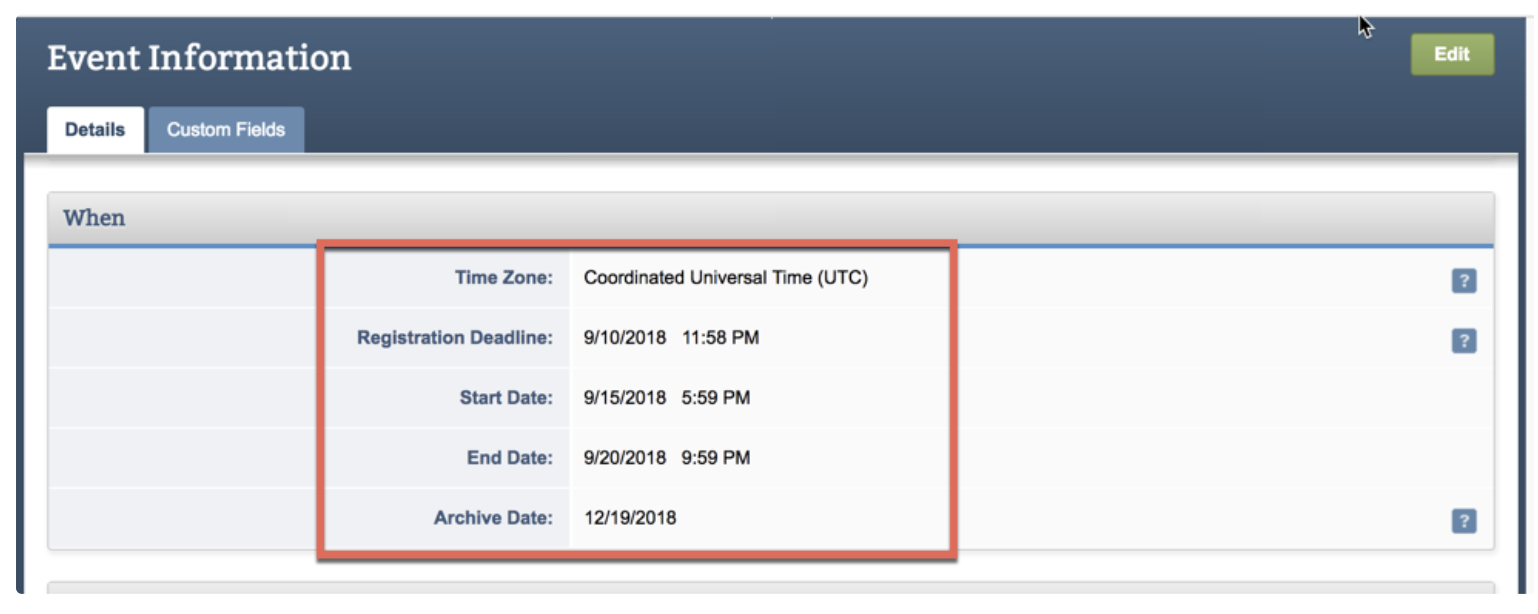 Unlike other datetime fields, the preceding 4 event-related datetime fields are imported as text and can be recognized in a database by a slightly different format (for example, the Start Date is imported as "2018-10-09T17:59:00", and would be "2018-10-09 17:59:00.000" if the Start Date is a default datetime value). Event-related datetime fields are relative to their own event time zone. Therefore, these event-related datetime fields are not treated as absolute time references like other fields.