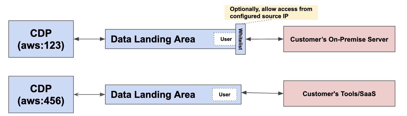 Data Landing is an intermediate storage area within Treasure Data ecosystem. This intermediate storage area provides the capacity for compliance with corporate security policies that you might have in place, and helps to avoid extra efforts in procuring intermediate storage solutions when integrating your data with Treasure Data. Because some corporate policies forbid directly sending files with Data Connectors from/to external cloud storage, an intermediate storage area can be used to stage and then import files into Treasure Data CDP or export to Data Landing for import back into your company's internal storage.