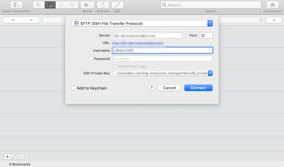 test.csvFrom a UI client, enter the endpoint, username (issued user id), password (if used) and specify your private key location.
