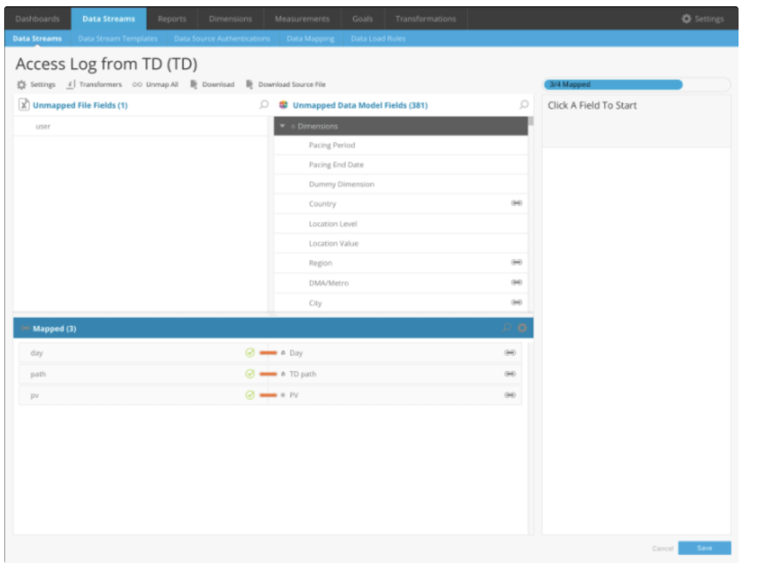 When you select Next, the Treasure Data SQL query executesand Datorama shows a list of columns of the result. In this screen, you map your original columns to Datorama’s global columns. With Datorama’s auto-mapping algorithm, some columns may be already mapped based on your previous mapping activities.