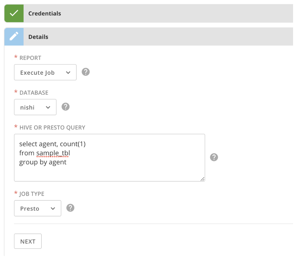 - In the Details section, select the Treasure Data report to run. For example, if you would like to use a custom query for a report, choose Execute Job and write your custom query.