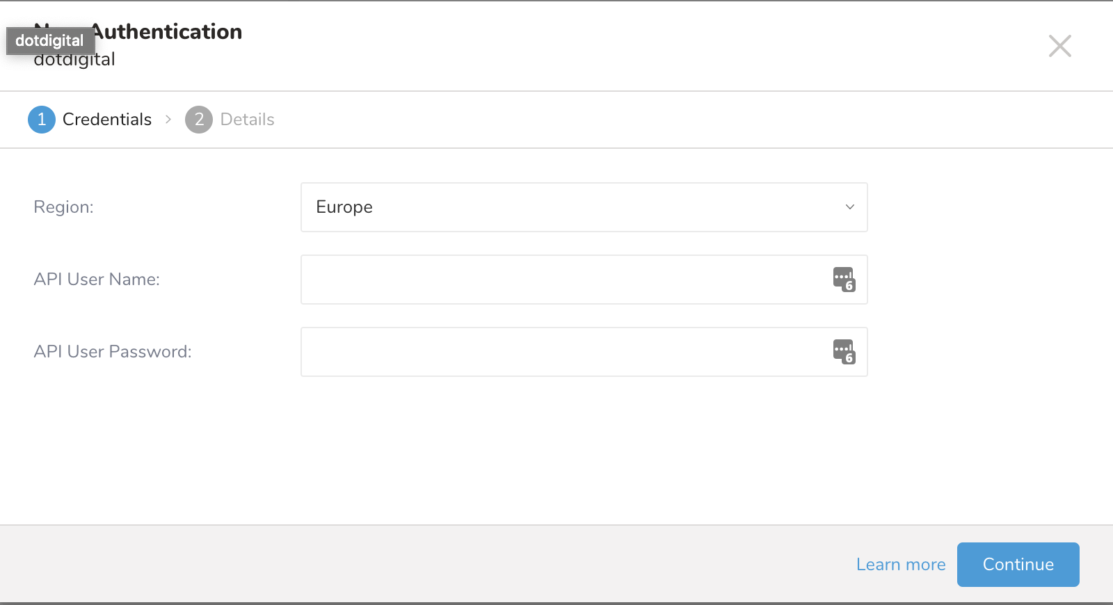 Type the required credentials for your new Dotdigital connection. Set the following parameters.