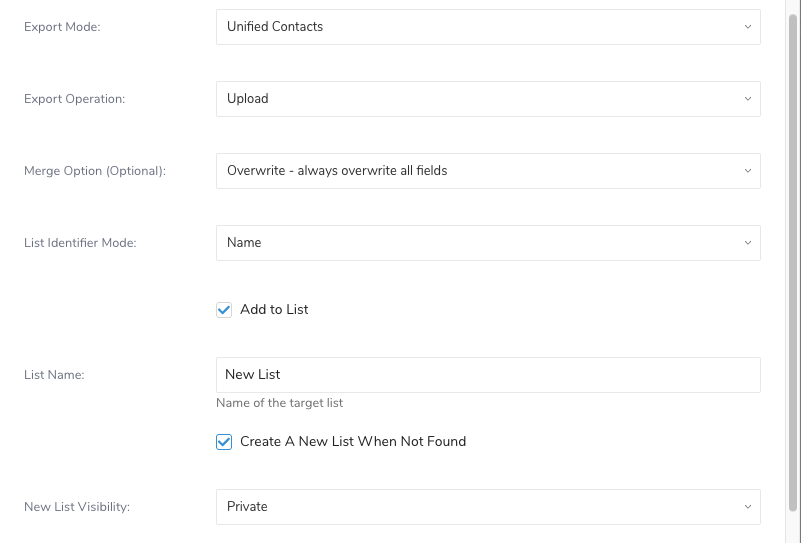 | List Name | Optional | List Name to interact with. This parameter is required in the following situations: - Export Operation is "Upload", and "Add to List" is enabled - Export Operation is "Delete" |