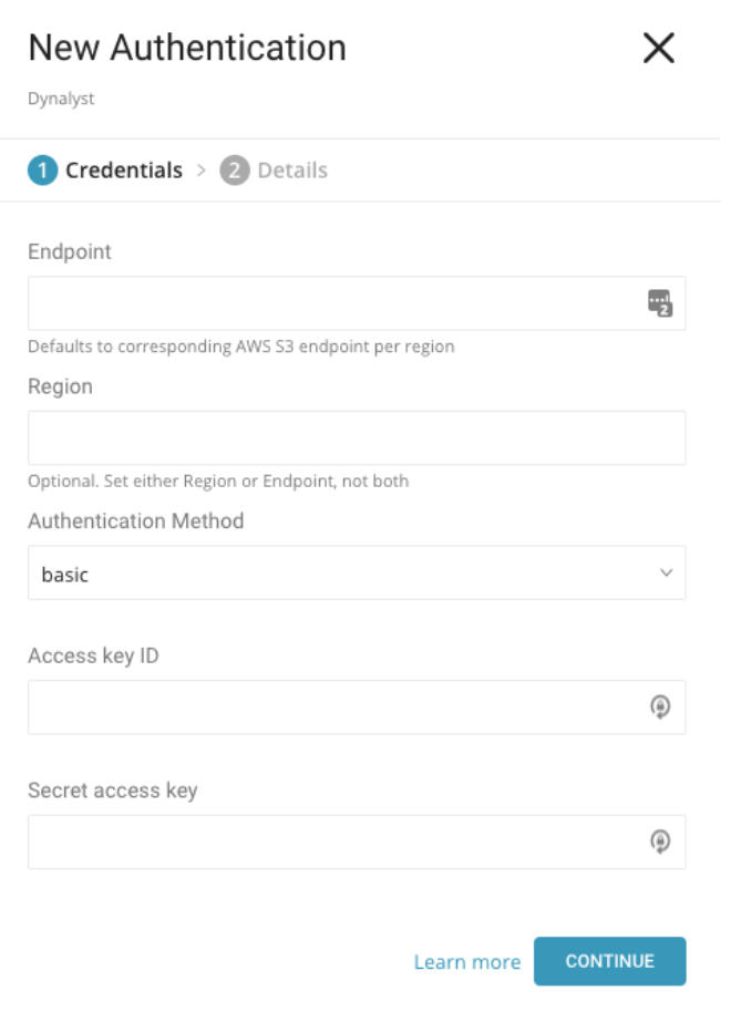 - Endpoint: S3 endpoint login user name. You can find region and endpoint information in your Dynalyst account. For more information, http://s3-ap-northeast-1.amazonaws.com