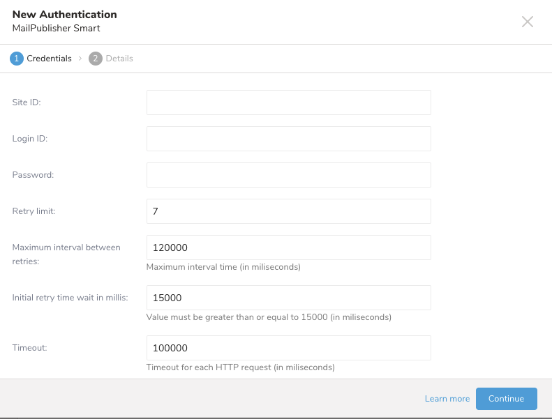Complete the new connection information, providing your MailPublisher Smart credential.