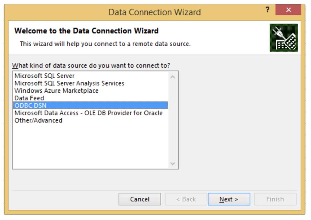 Open Excel and under the DATA section, click “From Other Sources”, and select “From Data Connection Wizard”.