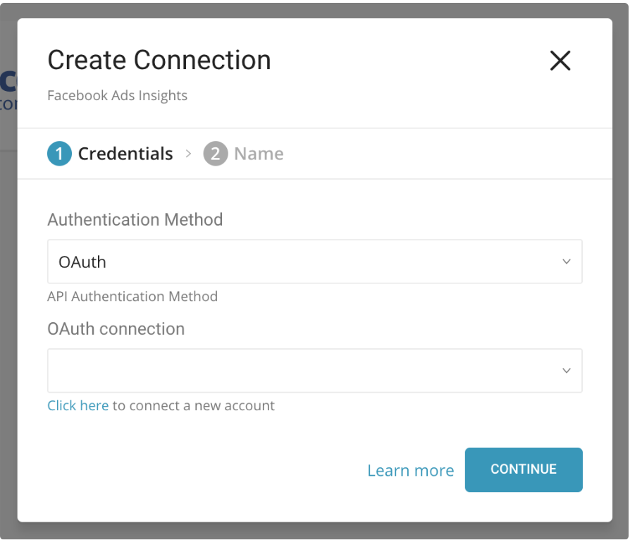 Go to Treasure Data Connections and search and select Facebook Ads. The following dialog opens.