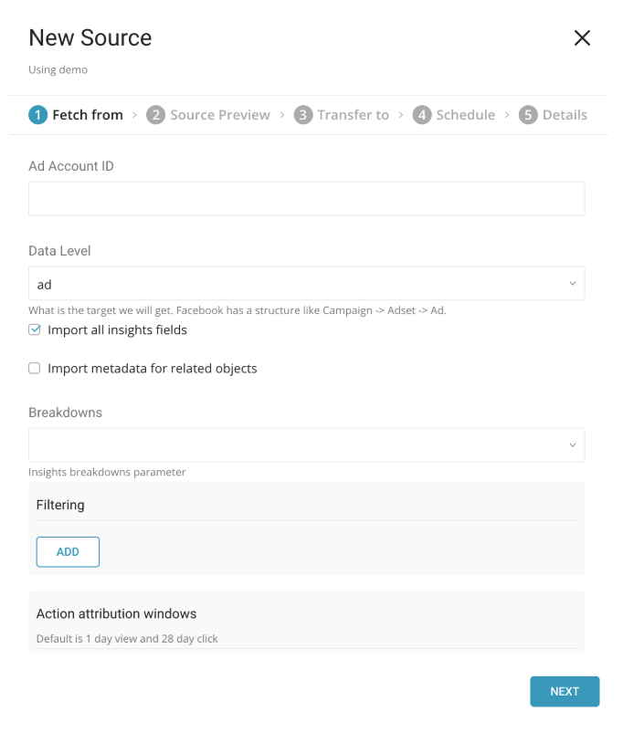 | data_level | Obtain data level. Facebook insights level: Campaign –> Adset –> Ad. Available options are “campaign”, “adset”, “ad”, or “ad_creative”. | string | optional | “ad” |