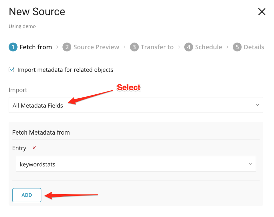Select All Metadata Fields to import all related edges. You can select which edges to import by adding each edge in Fetch Metadata.