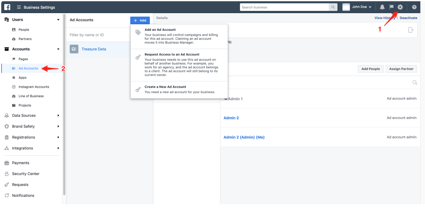 Add Ad Account: https://www.facebook.com/business/help/910137316041095