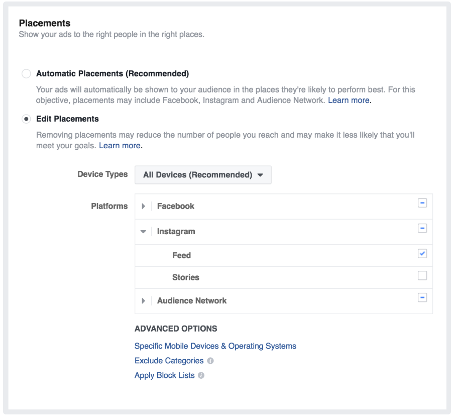 Open Facebook/Instagram Ads Manager to edit the ad placement. By default, Facebook will choose to display within Instagram Ads.