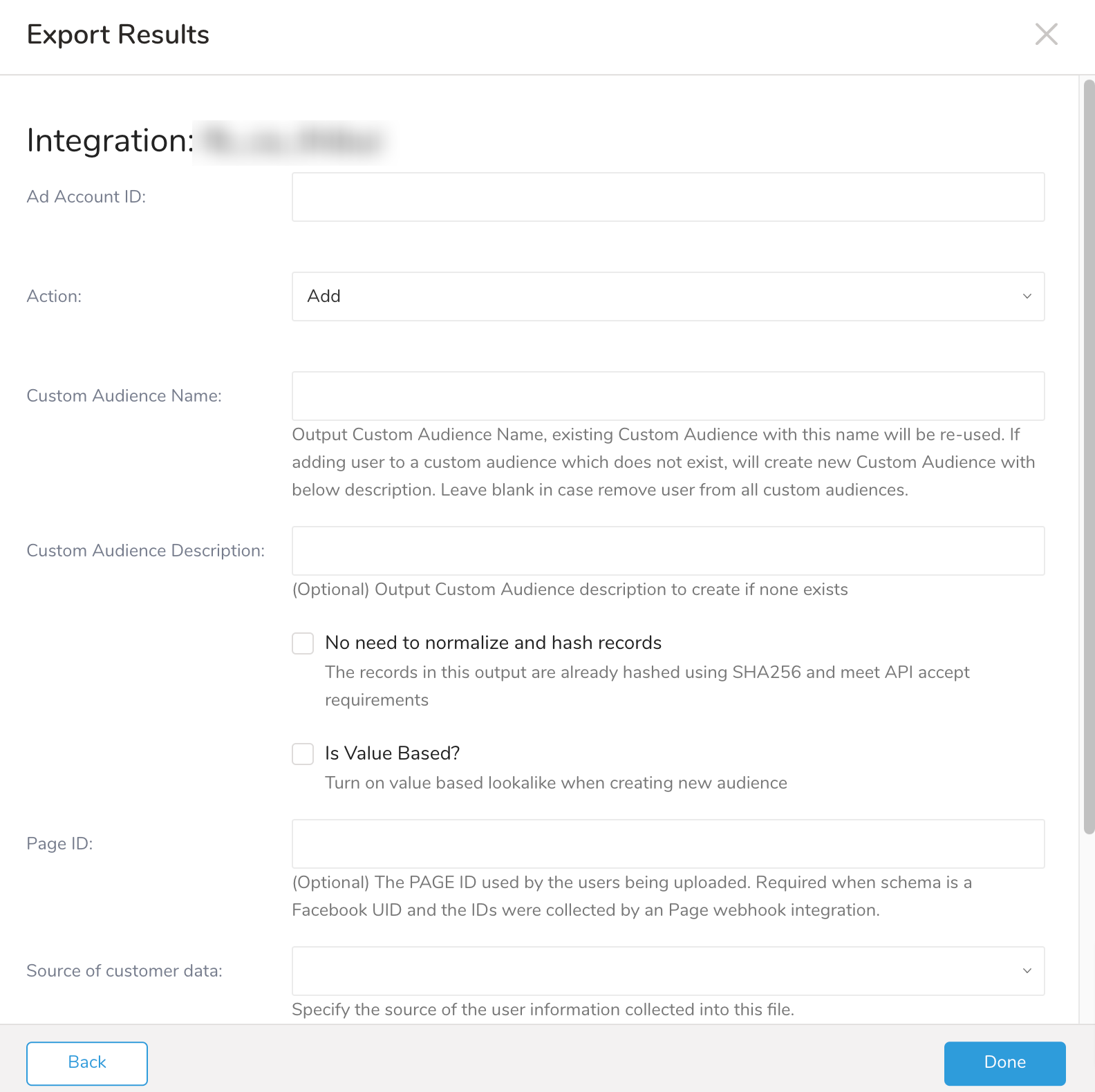 | Custom Audience Name (required) | Important note: If you have many Custom Audiences with the same name as this input, the latest Custom Audience Name will be used. We recommend that you give your Custom Audience a unique name. - Add: Creates a new Custom Audience with a given name, if a Custom Audience with the given name does not exist. The exported result is added (appended) to the target audience. - Replace: Replace the records in the Custom Audience with the given name with the new uploaded records. One job replacing a custom audience can be in process at any time. After the job finishes on the TD side, it takes some additional time on the Instagram side. During that time other users can't replace that custom audience. - Remove: Leave this field blank will remove users from all Custom Audiences, otherwise will remove users from this name. API parameter: output_name |