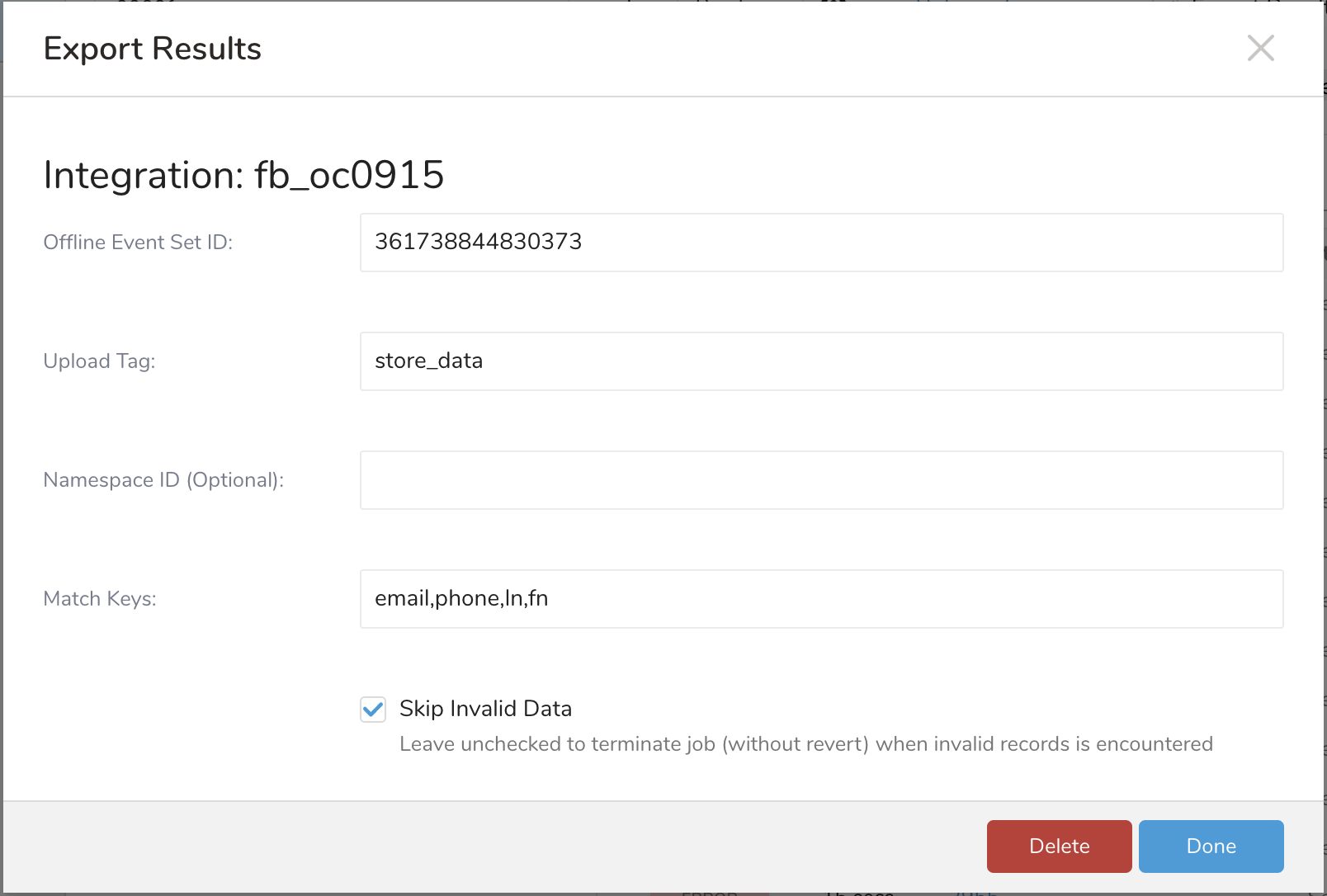 Additionally, the match_keys column and its data are hashed/normalized before being sent to Facebook. Learn more about hashing and normalization requirements. You need at least one match_keys column to configure export results.
