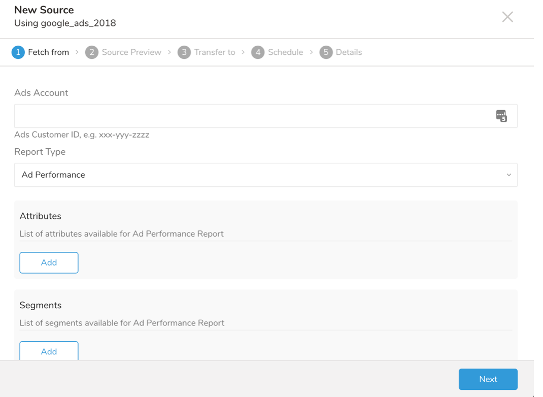 In the field Ad Account, enter the Customer ID in your Google Ads console UI.