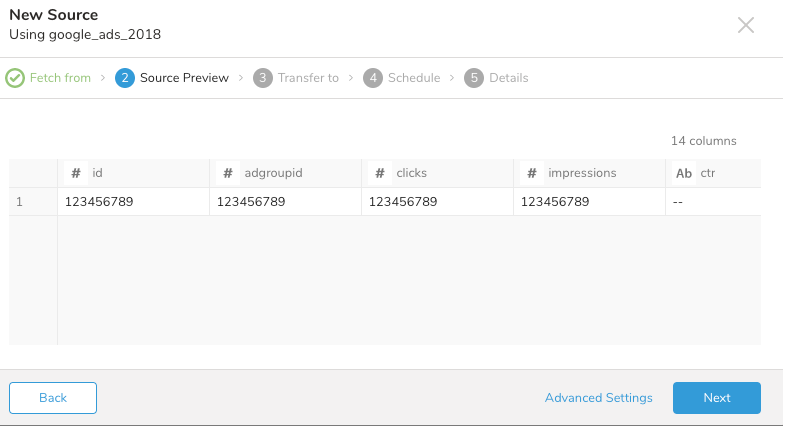 Next, you see a Preview of your data. The preview data doesn’t reflect the actual data from your Google Ads account. It’s just dummy data to show all the fields you picked, as well as the data type of those fields.