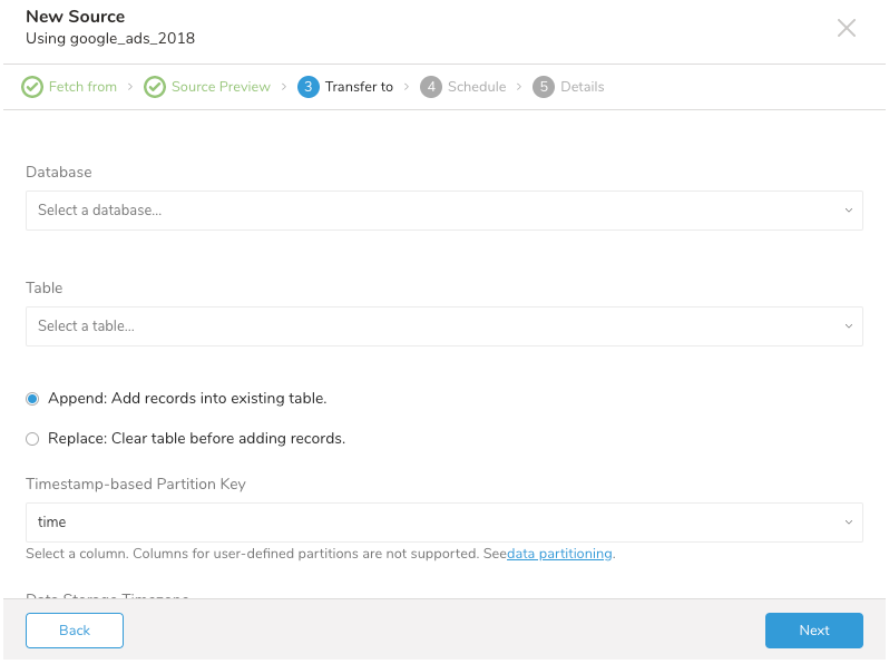 option, because Treasure Data’s storage is partitioned by time (see data partitioning). If the --time-column option is not available, the data connector selects the first long or timestamp column as the partitioning time. The type of the column specified by --time-column must be either of long or timestamp type (use Preview results to check for the available column name and type). A time column is available at the end of the output.