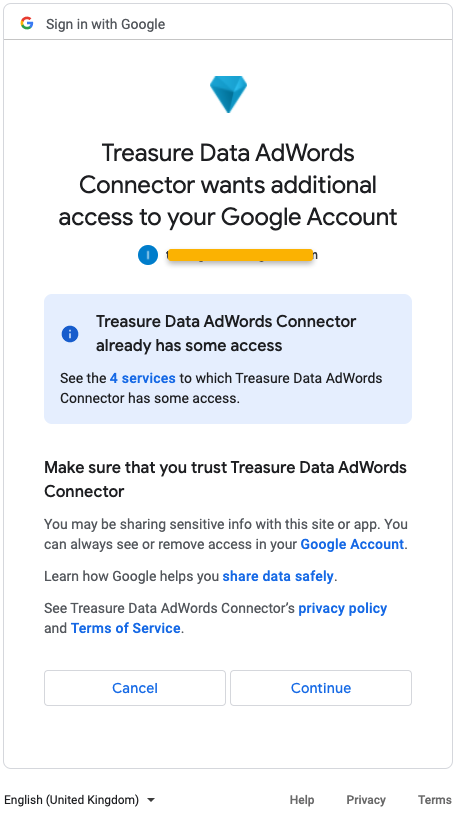 - Authorized Treasure Data Google OAuth app access to your own Google Ads Account.