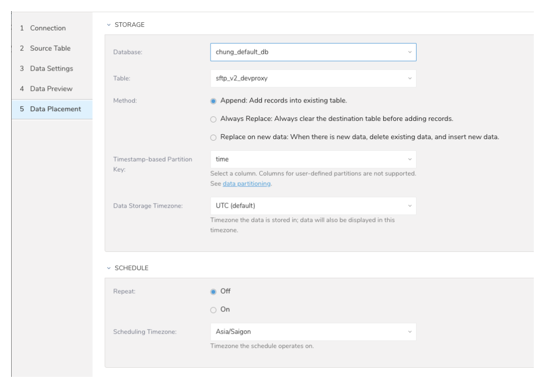 For data placement, select the target database and table where you want your data placed and indicate how often the import should run.