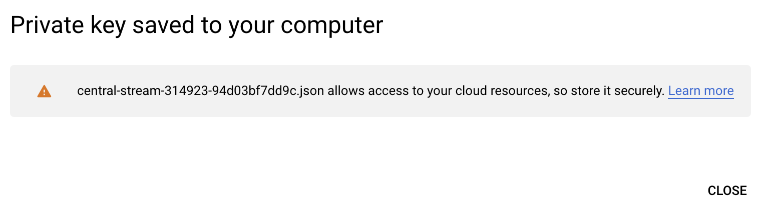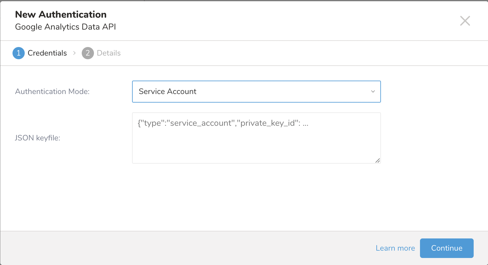 Enter the JSON key information. Make sure that you include the private key of the service account. Make sure that the entire JSON key information is in brackets {…}.