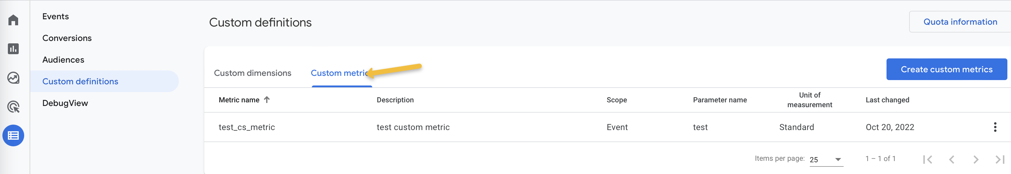 | Metrics | Metrics or Custom Metrics name. Visit https://developers.google.com/analytics/devguides/reporting/data/v1/api-schema for the list of dimensions and read Obtain the custom dimension or custom metrics name from Google Analyticsto retrieve list of custom Metrics For example: - promotionViews - promotionClicks - customEvent:test_cs_metric |