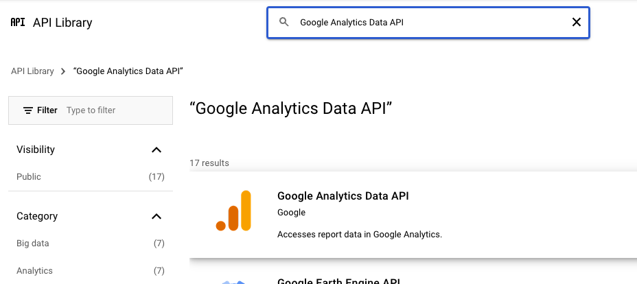 - From the Library page, type to search for the Google Analytics Data API, then press enter.