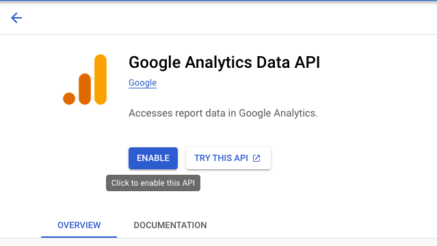 Enable the Google Analytics Data API v1. Navigate to the APIs & Services for your project, then select + ENABLE APIS & SERVICES