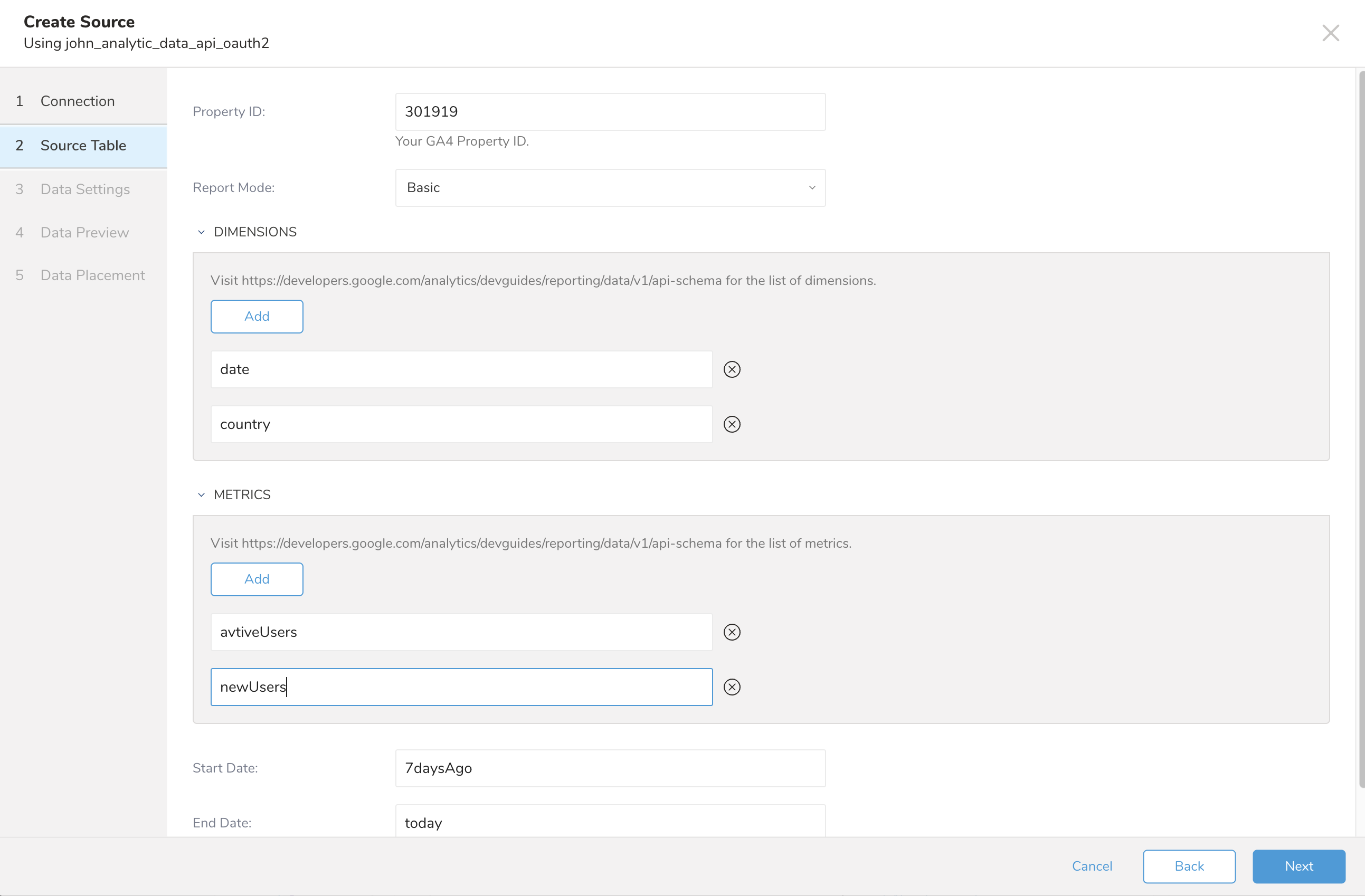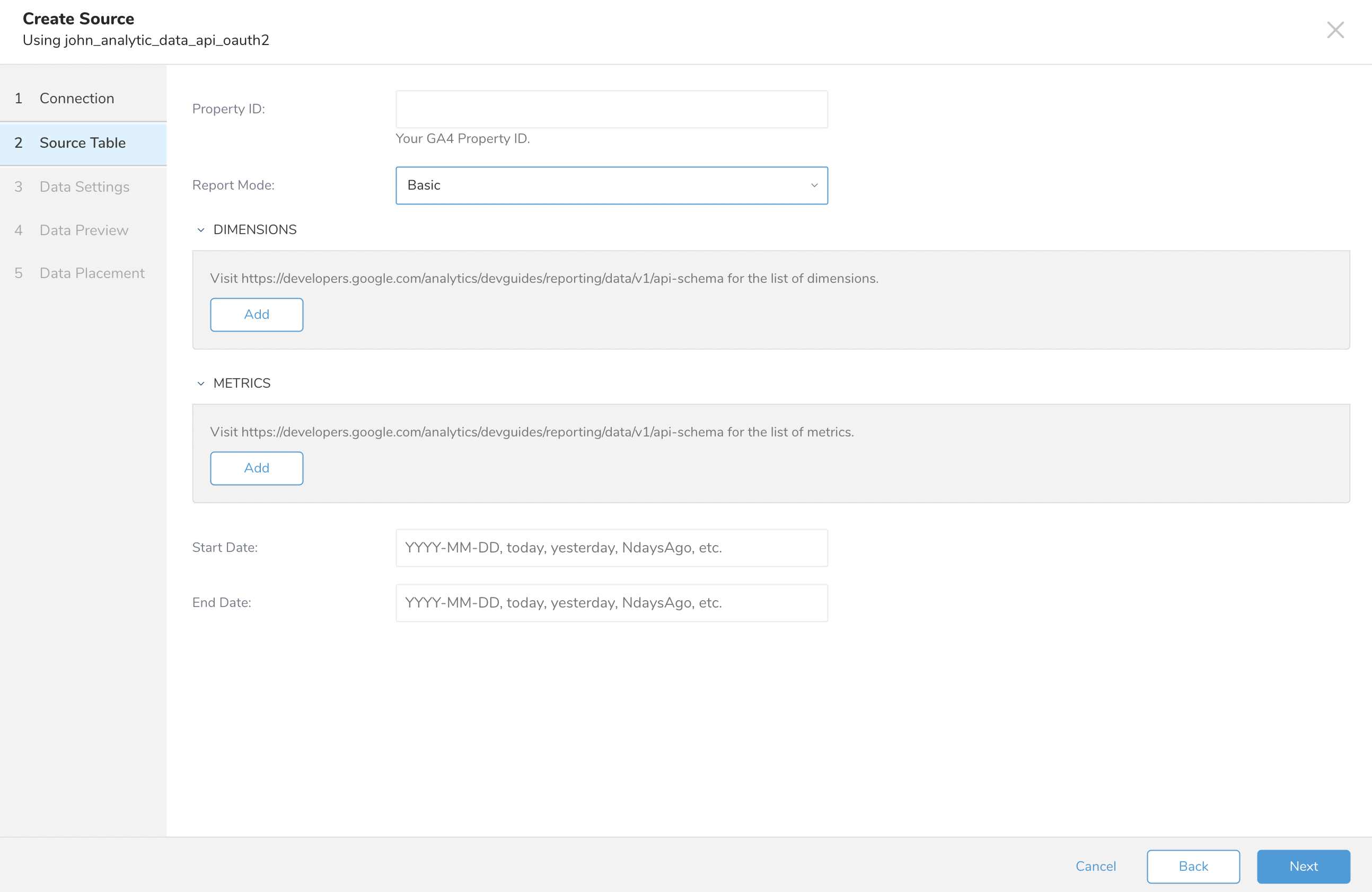 | Report Mode | Basic or Advanced report. Visit https://developers.google.com/analytics/devguides/reporting/data/v1/advanced in case you want to build an advanced report |