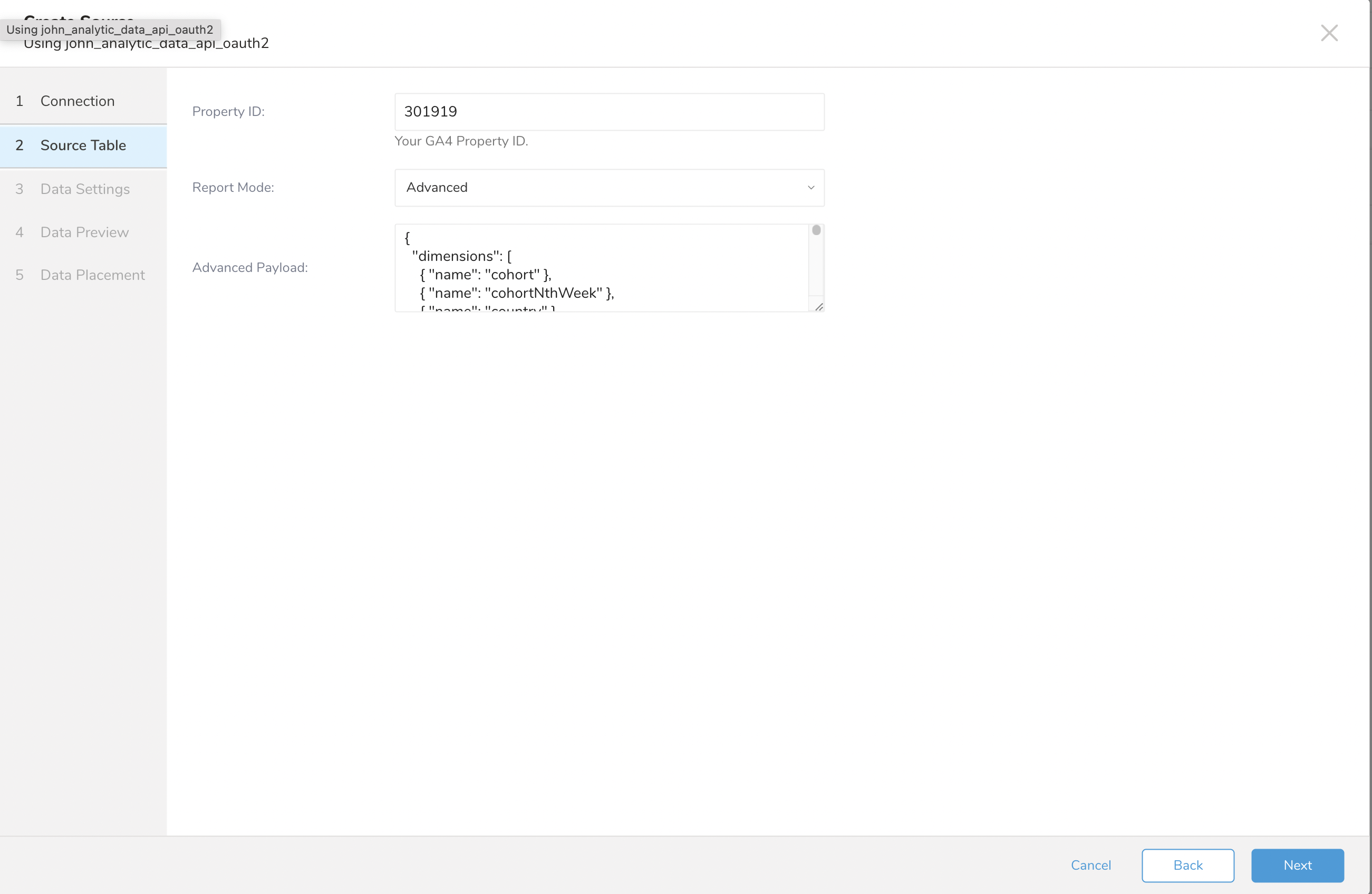 | Advanced Payload | Advanced report definition in JSON format. Visit https://developers.google.com/analytics/devguides/reporting/data/v1/advanced for more detail. For example:{ "metrics": [ { "name": "cohortActiveUsers" } ], "dimensions": [ { "name": "cohort" }, { "name": "cohortNthWeek" }, { "name": "country" } ], "cohortSpec": { "cohorts": [ { "dimension": "firstSessionDate", "dateRange": { "startDate": "2022-10-04", "endDate": "2022-10-10" } } ] } } |