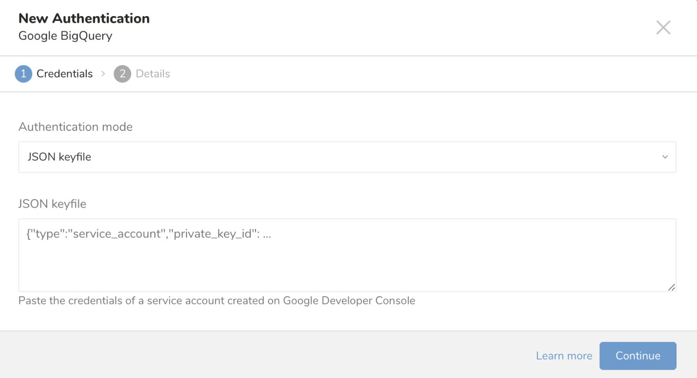 - A dialog will open, then choose an authentication mode. Only JSON keyfile is supported.