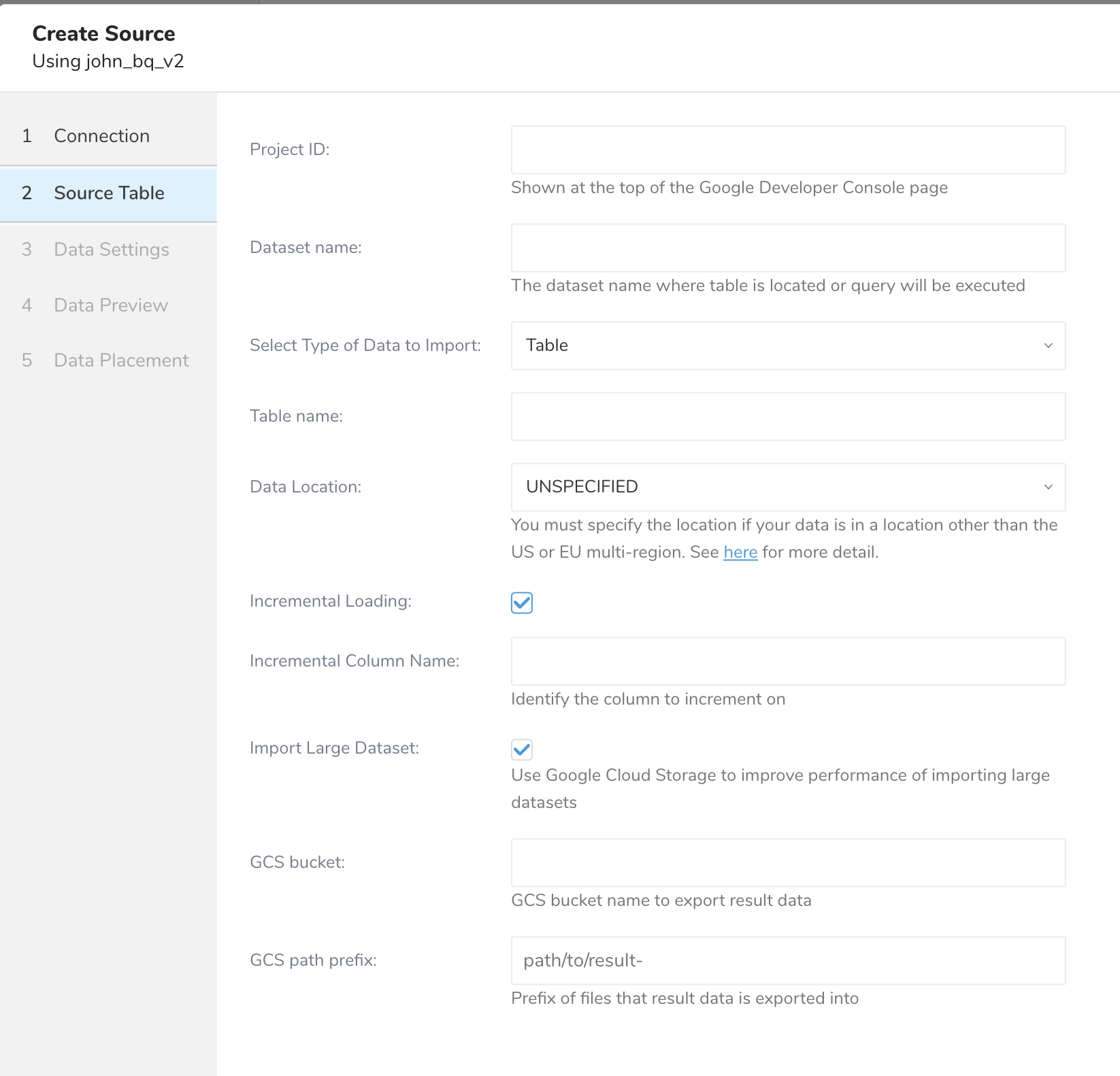 Configure the data source to import. Input an ID of your Google Cloud Platform project into "Project ID". Input a dataset name where store your table