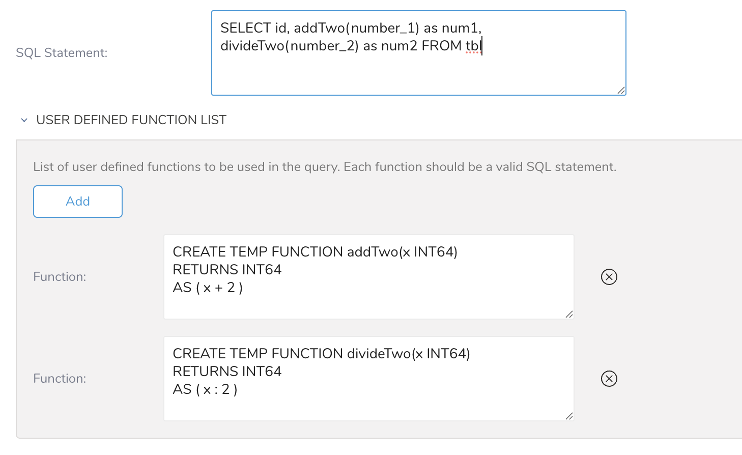CREATE TEMP FUNCTION addTwo(x INT64)