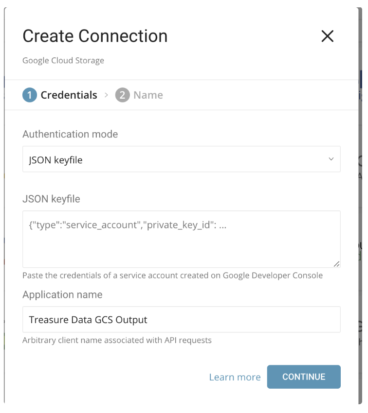 | Application Name | Treasure Data GCS Output is the default value. As this is an arbitrary client name associated with API requests, you can leave the default value (Treasure Data GCS Output). |